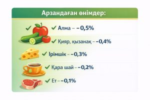 Кеңейтілген тізімге енген кейбір жаңа тауарлар бойынша баға 0,1–0,5 пайыз аралығында төмендеді. Бұл өзгеріс көлемі жағынан үлкен болмағанымен, бағаны тұрақтандыру бағытында алғашқы нәтижелердің байқала бастағанын көрсетеді. Атап айтқанда, алма 0,5 пайызға, қияр мен қызанақ 0,4 пайызға арзандады. Бакалея өнімдері арасында қатты және жартылай қатты ірімшіктің бағасы 0,3 пайызға, қара шай 0,2 пайызға төмендеді. Сонымен қатар ет пен балық өнімдері 0,1 пайызға, ал сүт өнімдері ішінде қаймақ 0,1 пайызға арзандады.