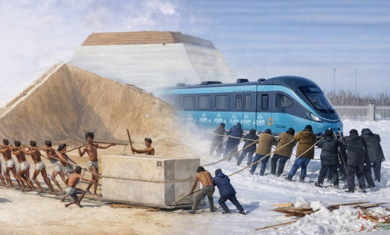«Египет пирамидасын салғандай болыпты ғой»: Желіде жұмысшылардың LRT вагондарын арқанмен сүйреп бара жатқан ВИДЕО-сы тарады