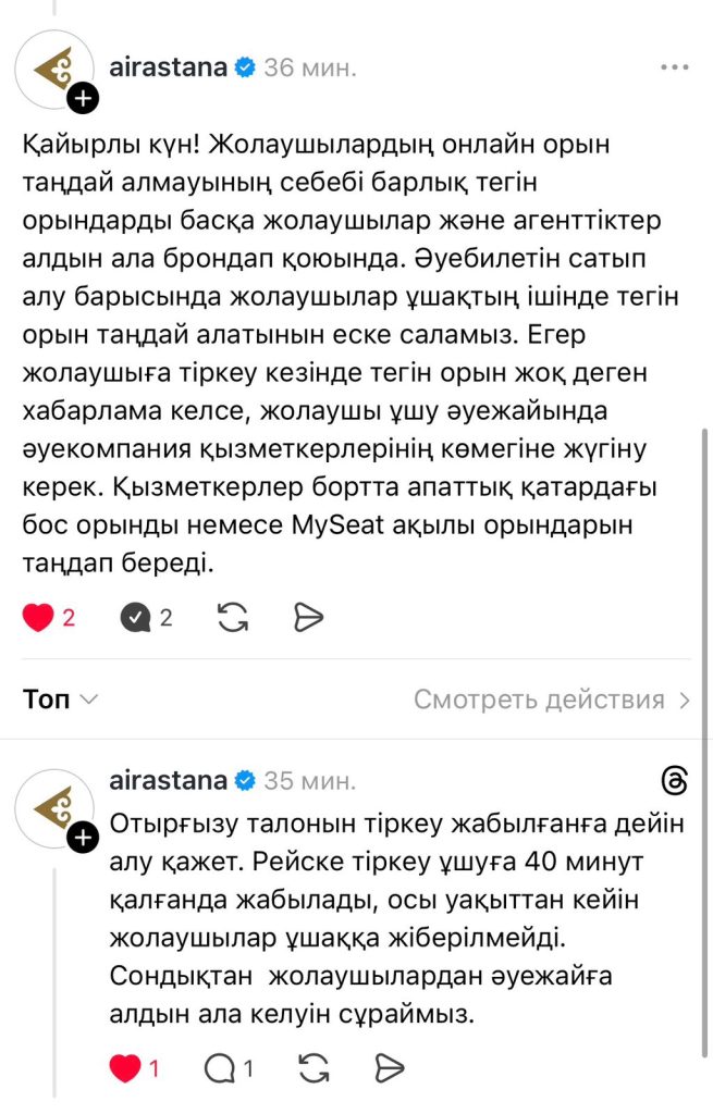 Tiek.kz Threads парақшасындағы жазбасына Air Astana жауабы